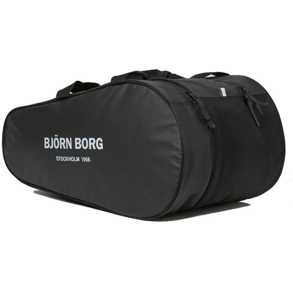 De Ace Padel tas L van Björn Borg biedt ruimte aan maar liefst zes rackets, verdeeld over twee handige compartimenten. Het duurzame ontwerp is gemaakt van ripstopmateriaal op basis van gerecycled polyester, met een beschermende coating. Draag de tas zoals u dat wilt: aan de hengels of comfortabel over uw schouders met de verstelbare banden. Binnenin vindt u een handig ritsvak en meshvakken voor uw ballen, afgesloten met hoogwaardige omgekeerde YKK-ritsen voorzien van herkenbare rubberen trekkers.