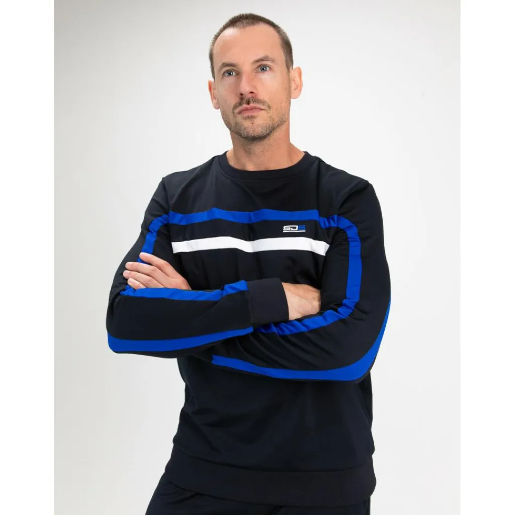 De Sjeng Sports Arav tennistrui voor heren heeft een crewneck en is donkerblauw met witte en blauwe strepen. Deze tennistrui van Sjeng Sport is gemaakt van powerstretch materiaal, dat heel rekbaar is.