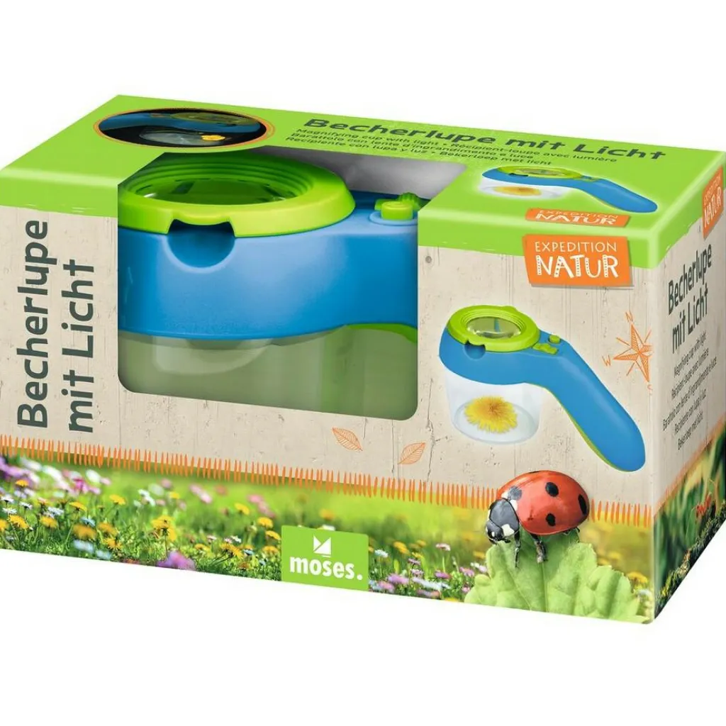 De Moses. Verlag Expeditie Natuur bekerloep met licht komt met een vaste beker, waarin uw kind een insect of ander klein object kan bekijken. Deze loep van moses. Verlag is makkelijk vast te houden bij het handvat en is voorzien van 9 kleine LED lampjes. Deze lampjes hebben 3 verschillende lichtsterktes. Op de bodem van de beker zitten een liniaal en luchtgaatjes verwerkt en de loep vergroot tot wel 8 keer. U heeft voor deze loep 3 AAA batterijen nodig, deze zijn niet inbegrepen.