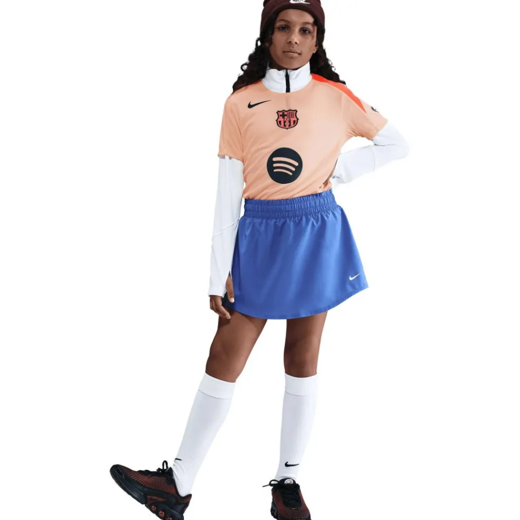 Het Nike FC Barcelona Strike derde shirt zorgt ervoor dat kinderen zich fris en zelfverzekerd voelen, dankzij de materialen die transpiratievocht afvoeren en snel drogen.