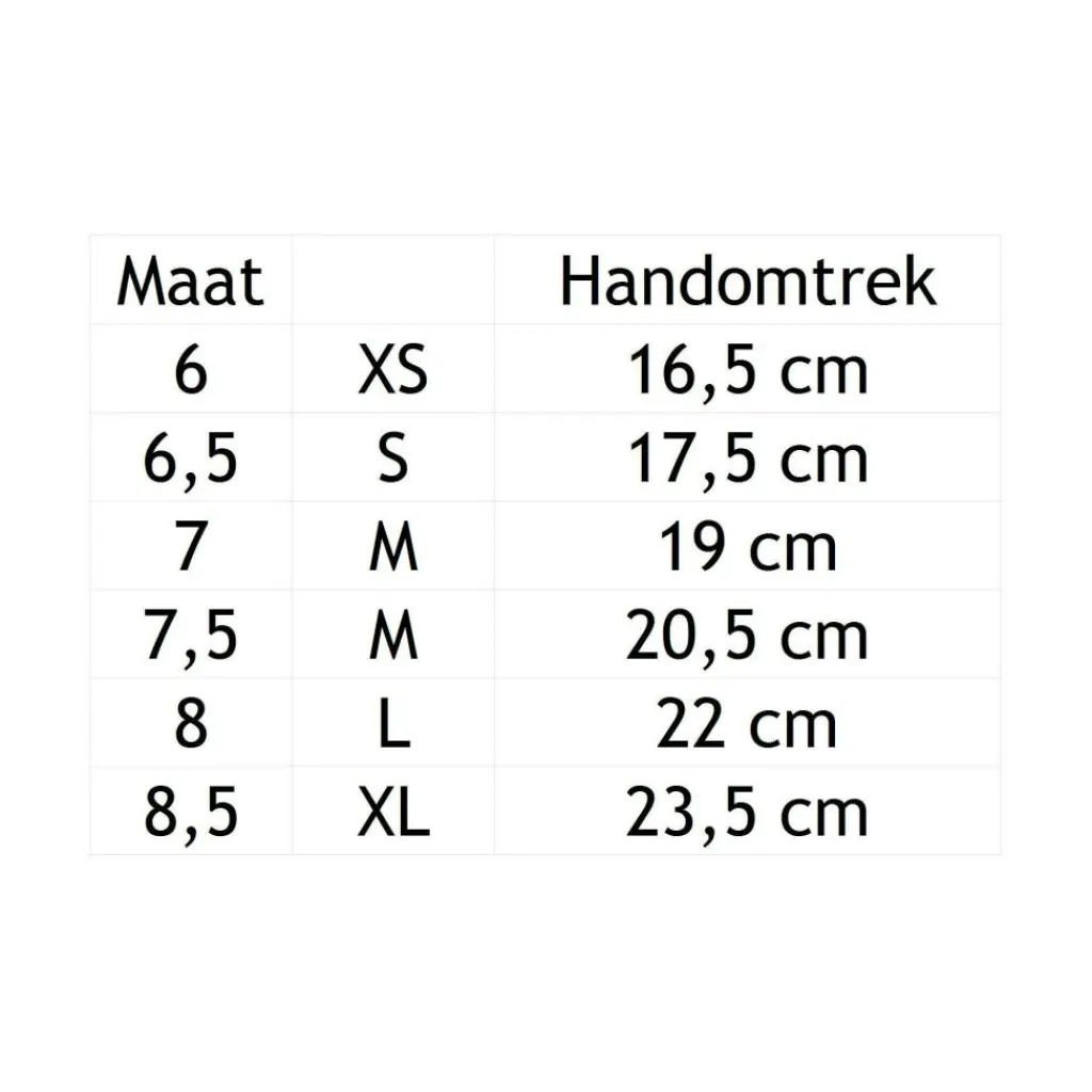 | Size | 6 (handomtrek 16,5 cm), 6,5 (handomtrek 17,5 cm), 7 (handomtrek 19 cm), 7,5 (handomtrek 20,5 cm), 8 (handomtrek 22 cm), 8,5 (handomtrek 23,5 cm) |