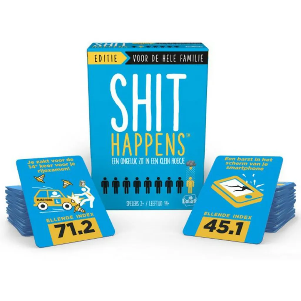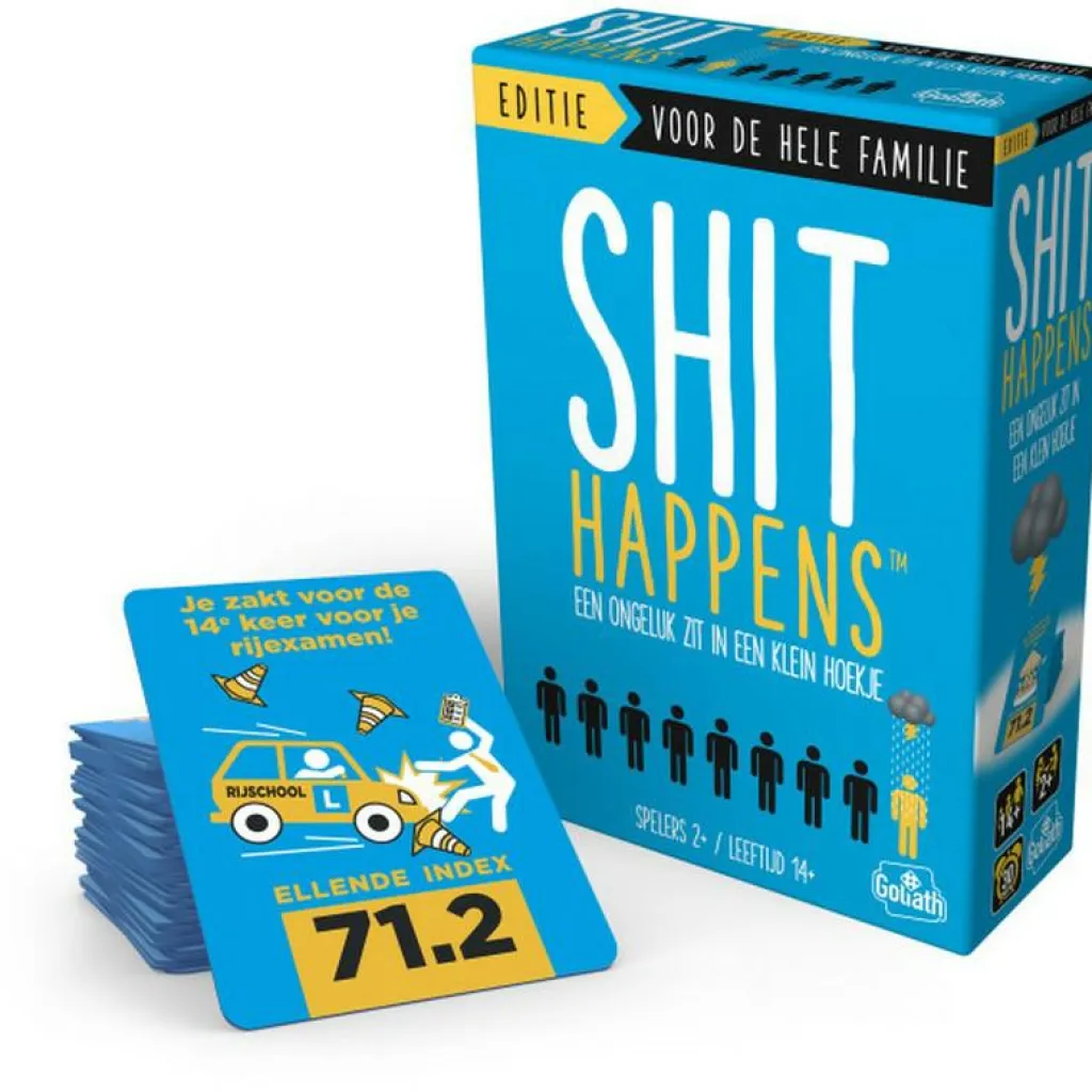 Het Goliath Shit Happens: Familie Editie kaartspel is een hilarisch gezelschapsspel voor het hele gezin. Rangschik de meest bizarre of gênante situaties op de Shit’O’Meter-schaal van 1 tot 100 en probeer goed in te schatten of iets milder, erger of precies ertussenin is. Wees scherp en tactisch, want wie als eerste tien kaarten correct rangschikt, wint het spel!
