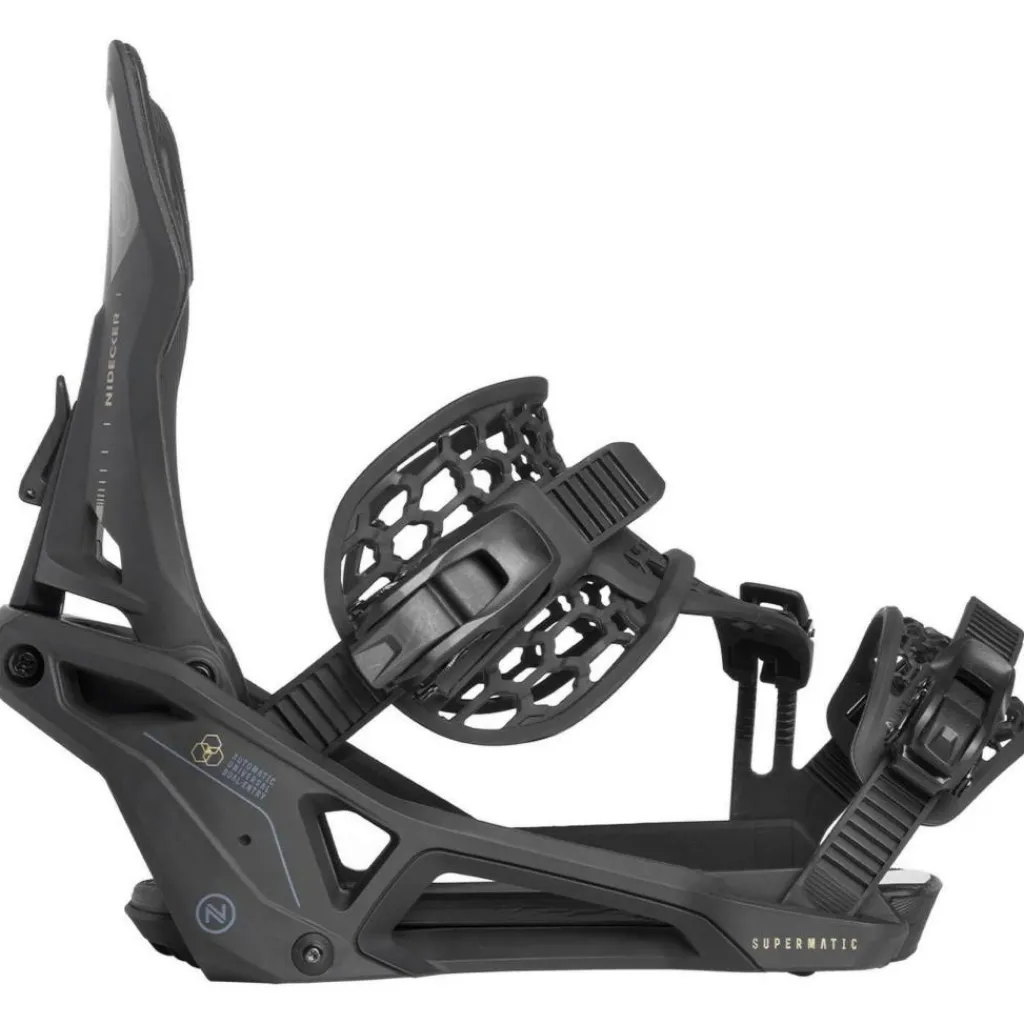 De Nidecker Supermatic bindingen zijn de eerste automatische bindingen die met elke schoenen compatibel zijn. Dankzij het intuïtieve ontwerp kunt u eenvoudig je voeten door de achterkant schuiven en op het hielpedaal trappen om de hiback automatisch omhoog te laten klappen. Een handige ontgrendelingshendel maakt het uitstappen net zo snel en eenvoudig. De Supermatic biedt de rijervaring van een klassieke tweebandsbinding, waarbij de ratels indien nodig handmatig kunnen worden bediend. De bindingen zijn gemaakt van betrouwbare materialen zoals een glasvezelnylon basisplaat, wat zorgt voor duurzaamheid en comfort. De AuxTech-banden zorgen voor een perfecte pasvorm rond de schoenen.