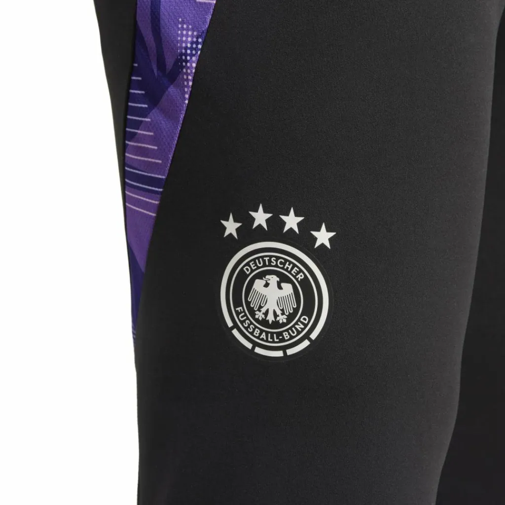 De adidas Duitsland Tiro 24 Competition trainingsbroek voor heren is een nauwsluitend model met ritsen bij de enkels. In de elastische tailleband is een trekkoord geplaatst. Er zijn twee voorzakken geplaatst met ritsen. De AEROREADY technologie zorgt ervoor dat transpiratievocht snel wordt weggevoerd van de huid, waardoor de huid droog blijft. Bij de knieholtes zijn mesh inzetstukken geplaatst voor extra ventilatie.