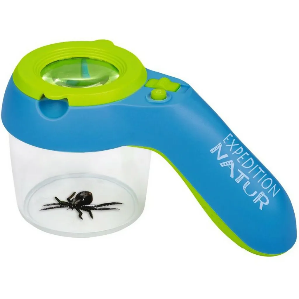 De Moses. Verlag Expeditie Natuur bekerloep met licht komt met een vaste beker, waarin uw kind een insect of ander klein object kan bekijken. Deze loep van moses. Verlag is makkelijk vast te houden bij het handvat en is voorzien van 9 kleine LED lampjes. Deze lampjes hebben 3 verschillende lichtsterktes. Op de bodem van de beker zitten een liniaal en luchtgaatjes verwerkt en de loep vergroot tot wel 8 keer. U heeft voor deze loep 3 AAA batterijen nodig, deze zijn niet inbegrepen.