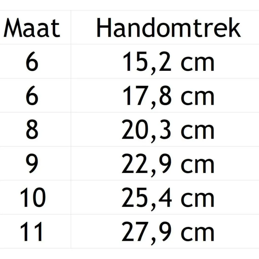 | Size | 10 (handomtrek 25,4 cm), 8 (handomtrek 20,3 cm), 9 (handomtrek 22,9 cm) |