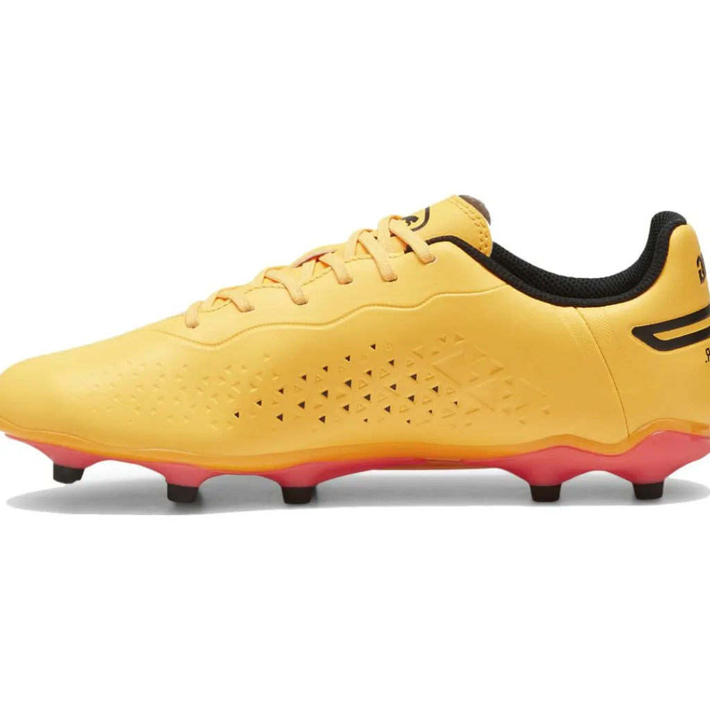 De Puma KING MATCH FG AG voetbalschoenen voor heren hebben een felle kleur die u goed laat opvallen op het veld. Deze voetbalschoenen zijn gemaakt van 20% gerecycled materiaal. De schoenen voelen licht en het bovenwerk sluit goed aan op de voeten. Het bovenwerk heeft een zacht oppervlak, waardoor u een ultiem balgevoel ervaart. De buitenzool is gemaakt van stevig TPU die voorzien is van noppen, zodat u een goede stevige grip op het veld hebt.
