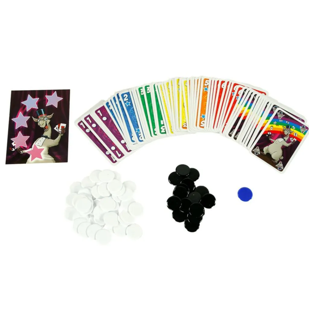 Lama: Cadabra van 999 Games is een toegankelijk en vlot kaartspel voor het hele gezin, ideaal voor tussendoor. Dit snelle spel, geschikt voor 2 tot 6 spelers, biedt eenvoudige spelregels met enkele verrassende twists, wat het uitdagender maakt dan zijn voorganger, L.A.M.A. Het doel blijft om alle minpunten af te leggen, maar nu kunnen minpuntenfiches slim naar andere spelers worden doorgespeeld. Tijdens een goochelvoorstelling mag u een fiche afgeven als u een lama speelt, maar hebt u geen lama, dan kan alleen een magisch fiche u redden. Speel tactisch met speciale kaarten en ruil minpuntenfiches slim om bij goocheltrucs. L.A.M.A.: Cadabra is een ideaal spel voor spelers die van eenvoudige keuzes en een vleugje sabotage houden.