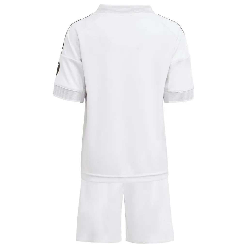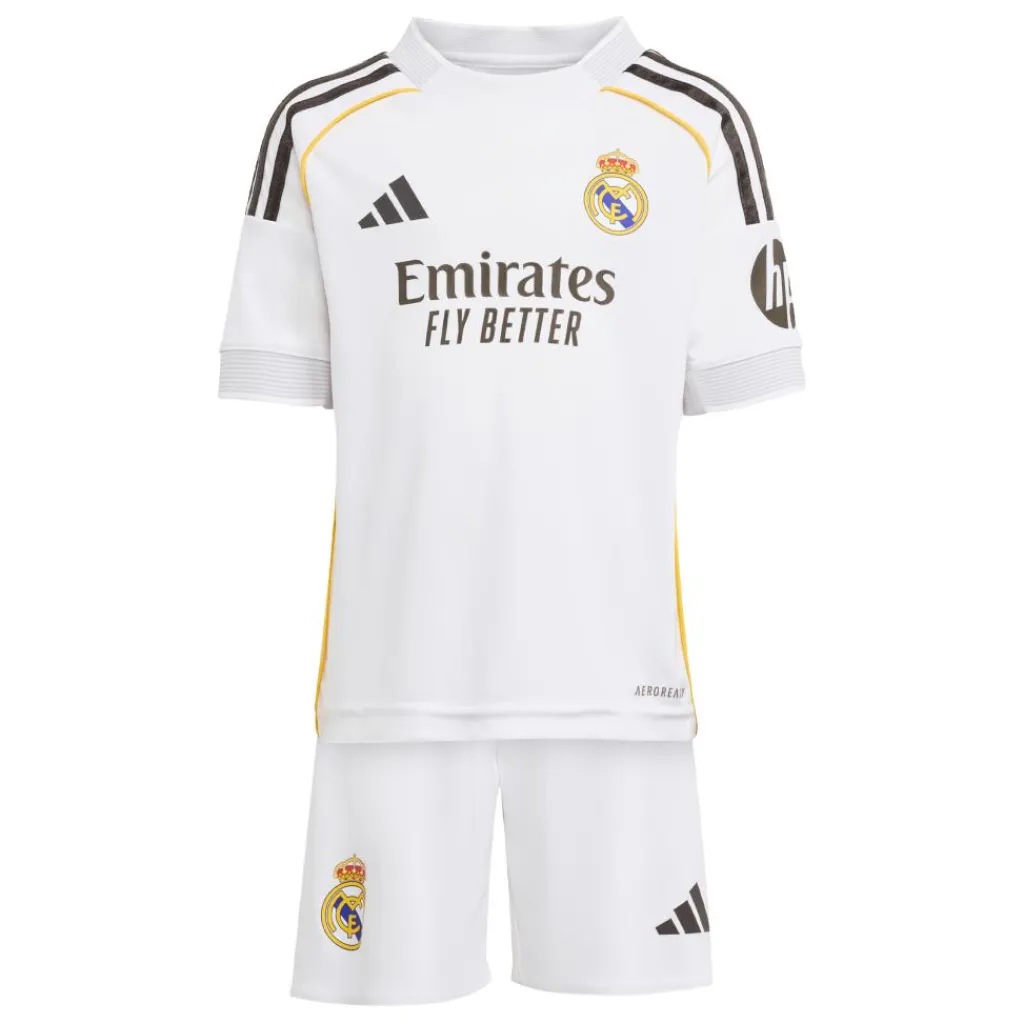 Het adidas Real Madrid thuistenue 25 – 26 is de perfecte set voor kinderen. Deze set bevat het thuisshirt, thuisbroekje en thuissokken. Het is een fijne set om mee te voetballen door de vochtregulerende AEROREADY technologie.