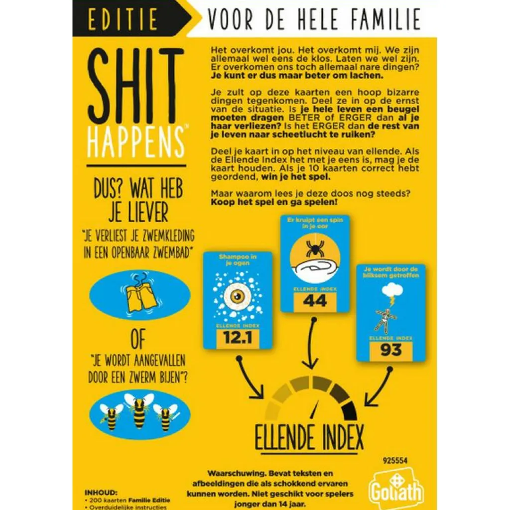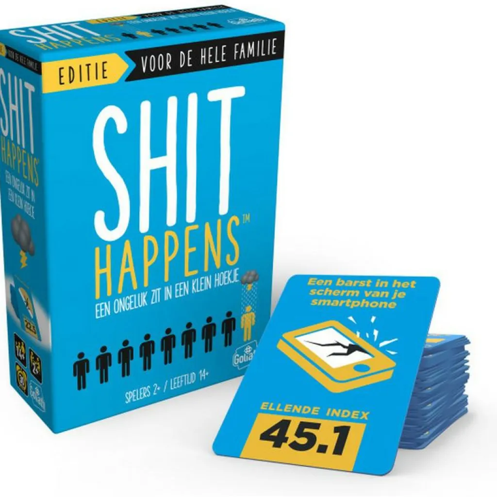 Het Goliath Shit Happens: Familie Editie kaartspel is een hilarisch gezelschapsspel voor het hele gezin. Rangschik de meest bizarre of gênante situaties op de Shit’O’Meter-schaal van 1 tot 100 en probeer goed in te schatten of iets milder, erger of precies ertussenin is. Wees scherp en tactisch, want wie als eerste tien kaarten correct rangschikt, wint het spel!