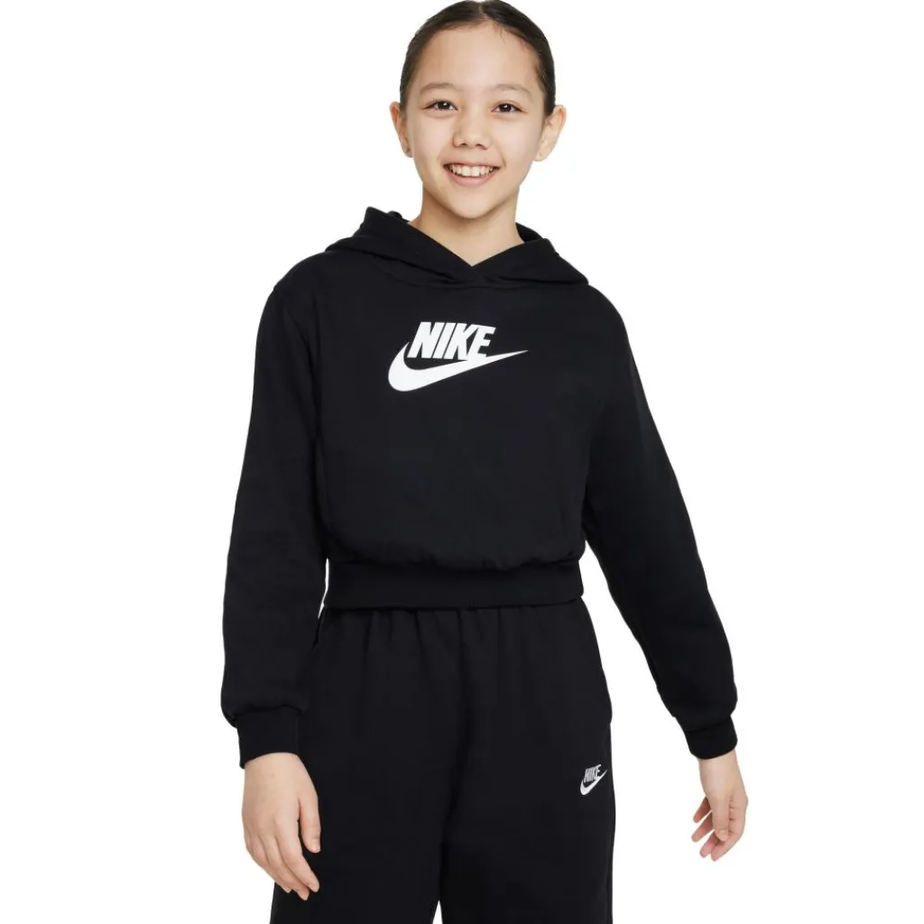 De Nike Sportswear Club fleece hoodie voor kinderen is ideaal om in te chillen thuis, maar is ook perfect voor elk moment van de dag. De trui heeft een gladde fleece buitenkant en een zacht geborstelde fleece binnenzijde. Het model is korter dan een standaard trui en zit de hele dag comfortabel.