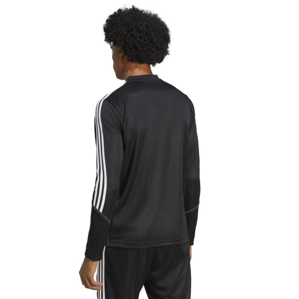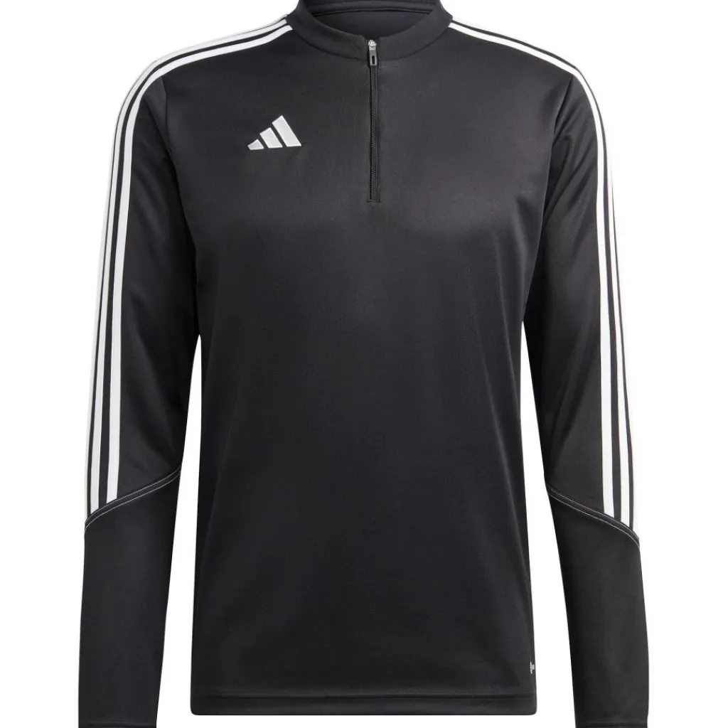 Het adidas Tiro 23 Club trainingsshirt voor heren heeft opvallende lijnen op de armen staan. De opstaande kraag heeft een rits en de trui houdt u goed warm tijdens de training. De stof droogt snel en voelt aangenaam op de huid.